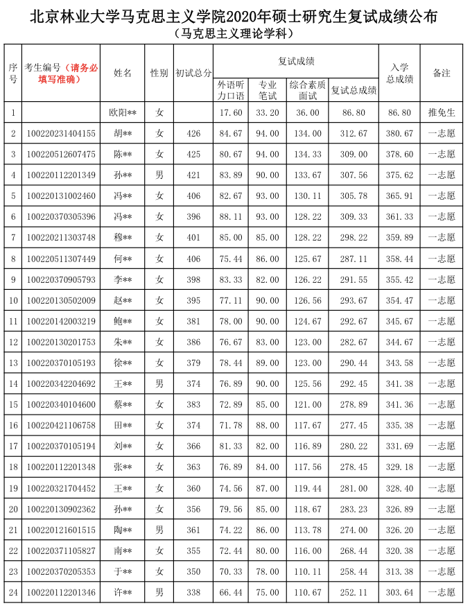 北京林业大学马克思主义学院2020年硕士研究生复试成绩公布(马克思主义理论学科)