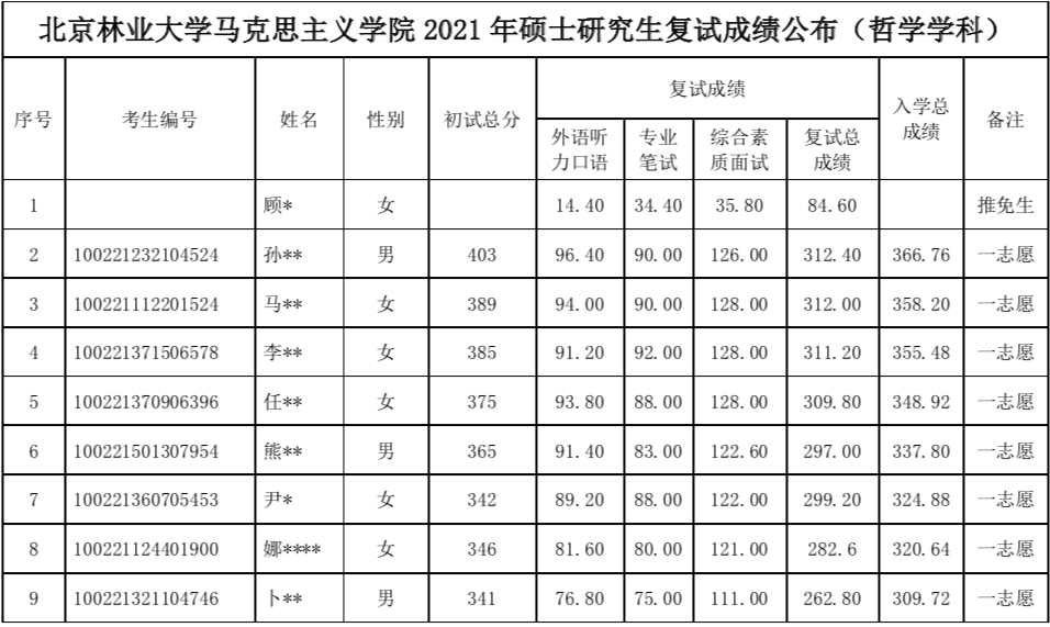 北京林业大学马克思主义学院2021年硕士研究生复试成绩公布(哲学学科)