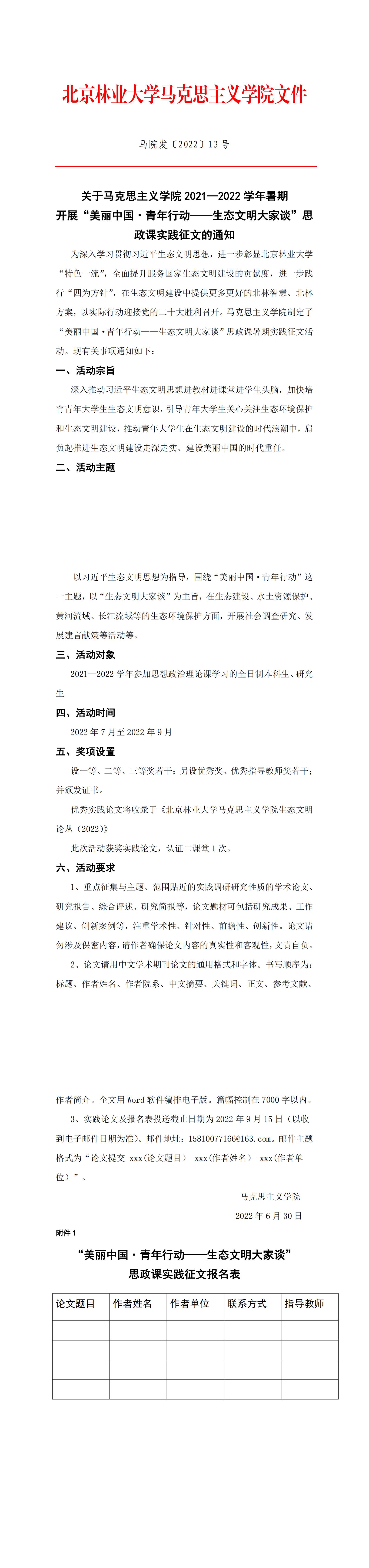 马院发【2022】13号关于马克思主义学院2021—2022学年暑期开展“美丽中国·青年行动——生态文明大家谈”思政课实践征文的通知.pdf